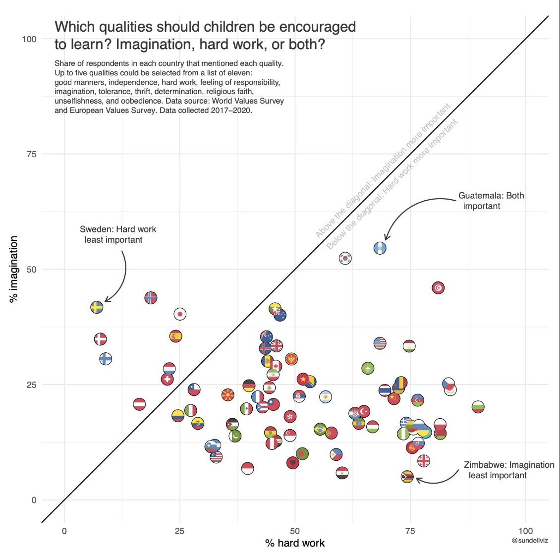 Many Nordic countries said they wanted to encourage children to learn imagination the most, with Sweden being the country to list hard work as the least important attribute. Guatemala and South Korea were the countries that overwhelmingly valued both imagination and hard work. Zimbabwe was the country that listed imagination as the least important quality.