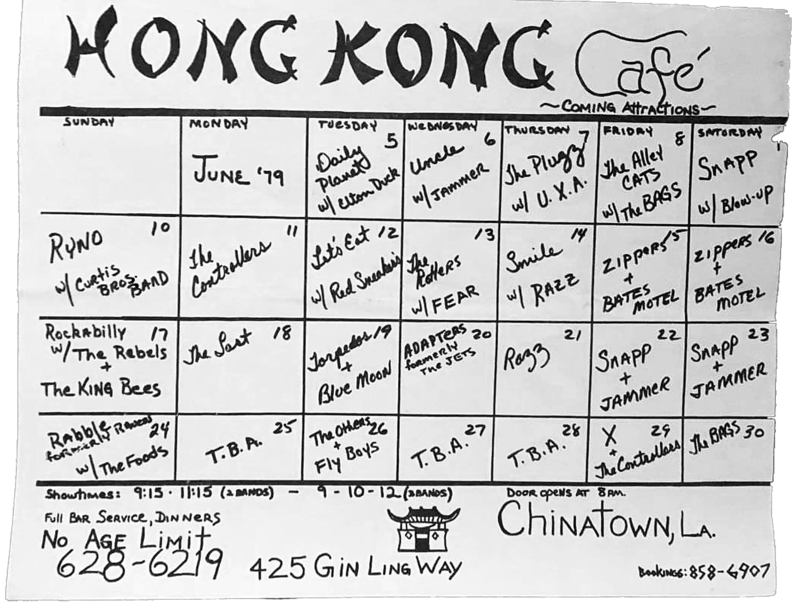 Hong’s restaurant—known as the Hong Kong Café to showgoers—was far from the only Asian restaurant to incubate the California punk scene. In the late 1970s and early ‘80s, from Sacramento to San Francisco, some of the state’s most important punk venues were actually Chinese and Filipino restaurants. At eateries like Sacramento’s China Wagon and Kin’s Coloma, or San Francisco’s Mabuhay Gardens, now-iconic bands such as X, the Germs, and Black Flag played some of their most memorable early gigs. The Hong Kong wasn’t even the first place in LA’s Chinatown to host gigs: the restaurant across the courtyard, Madame Wong’s, had already been doing the same for at least a year…